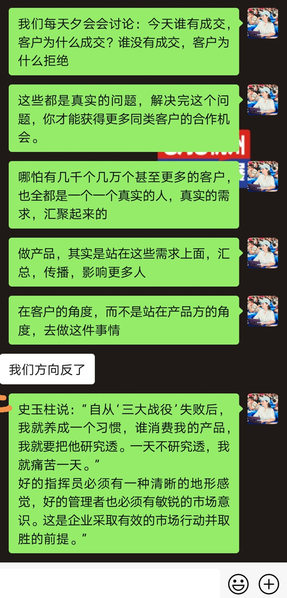 妮妮还举例说:我们每天夕会会讨论:今天谁有成交,客户为什么成交?谁没有成交,客户为什么拒绝,这些都是真实的问题,解决完这个问题,你才能获得更多同类客户的合作机会。