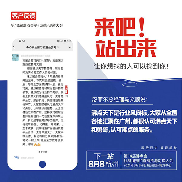 刚刚结束的第13届沸点会暨平台选品对接会,好评如潮,本次大会由沸点天下举办,由沸点天下举办,吸引了来自全国的600多家供应链和来自社群团购,社区团购,直播个人,直播机构,微信群,自媒体,平台等多个渠道的众多采购方前来找品合作,会后获得参会者一致好评,深圳市鑫鼎威贸易有限公司受邀参加本次活动。