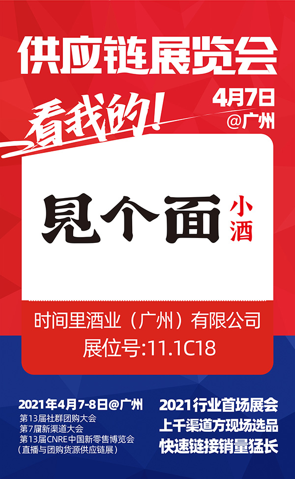 由沸点天下、沸点会展、4458货源网联合举办的“2021第七届新渠道大会(社群与直播供应链展)、第13届CNRE中国新零售博览会”,参展商和平台方都在踊跃报名中,时间里酒业(广州)有限公司(以下简称“见个面小酒”)受邀参展2021社群团购供应链开年展!