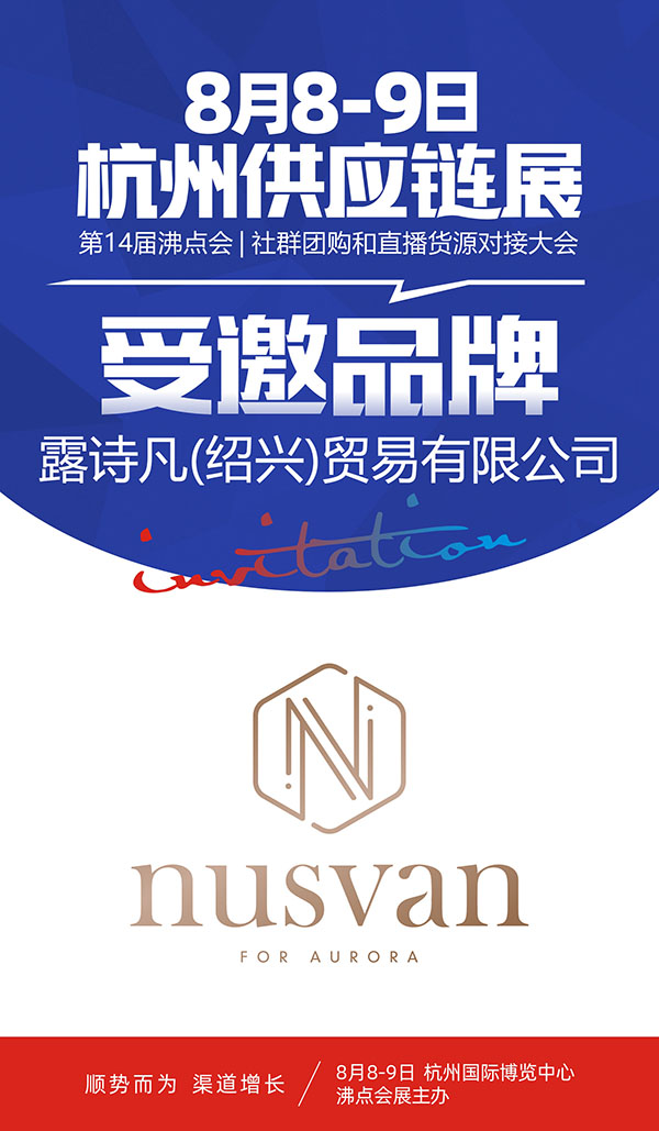 8月8杭州供应链展由沸点会展主办,4458和万团会联合承办,本次大会以“顺势而为,渠道增长”为主题,将聚集600+供货商,500+平台,500+MCN机构及个人主播,300+供应链前来选品洽谈合作;更有20+名嘉宾与会,围绕社群团购趋势、爆品打造、人员裂变、活动运营、品牌塑造等多个维度进行探讨交流,露诗凡(绍兴)贸易有限公司携NUSVAN品牌受邀参展本次展会。
