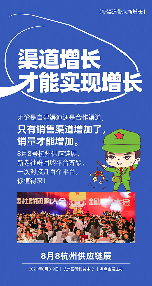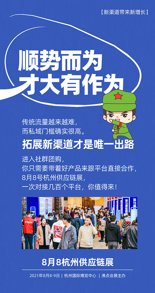 新渠道带来新增长,8月8杭州供应链展,几百个平台现场选品,现在就预定展位,提升销量,实现增长!