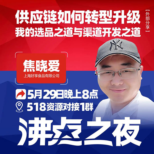 2021年5月29日晚上8点,本期沸点之夜的分享嘉宾是好享食品创始人焦晓爱,他以“供应链转型升级,我的选品之道与渠道开发之道”这一主题内容,为大家带来了精彩的分享。