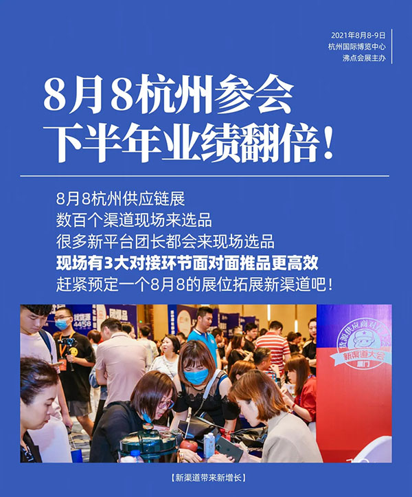 8月8杭州供应链展,数百家平台现场选品,欢迎你带着你的产品站出来,让更多未来的合作伙伴看到你,并跟你产生合作,新渠道带来新增长。