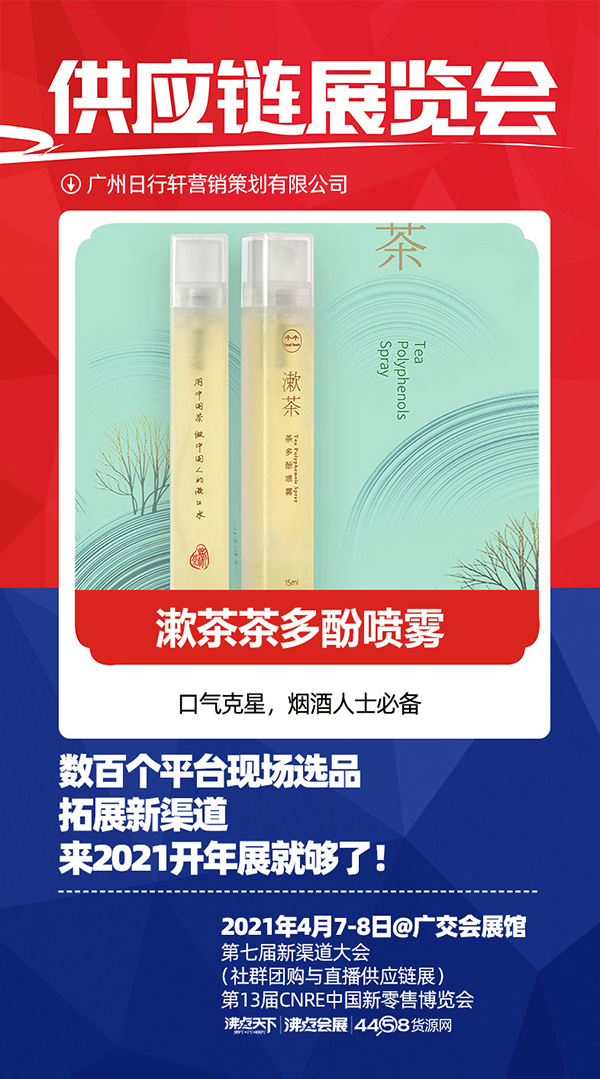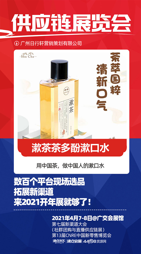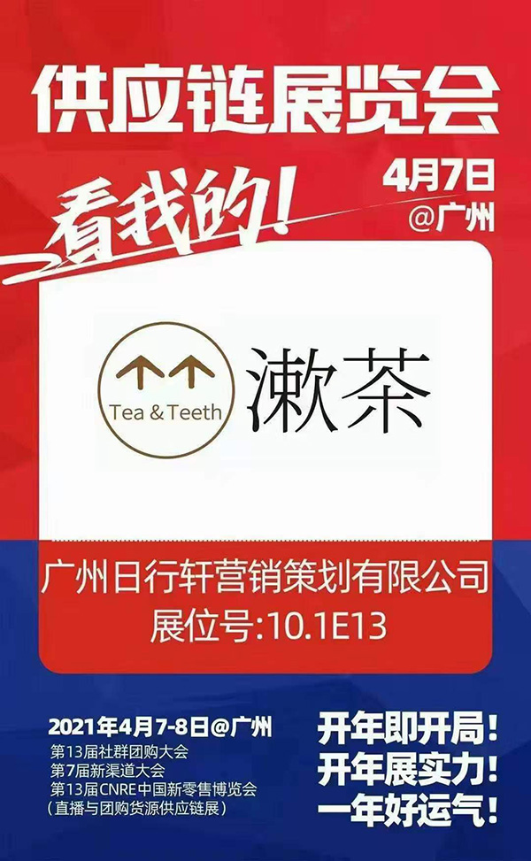 由沸点天下举办,沸点会展和4458联合承办的2021社群团购供应链开年展暨第13届社群团购供应链展将于2021年4月7-8号在广州广交会馆举办。这次展会以【新渠道,新机遇,新增长】为主题,旨在让更供货商快速对接新渠道,获得更增长。广州日行轩营销策划有限公司携自有品牌“漱茶”受邀参展。