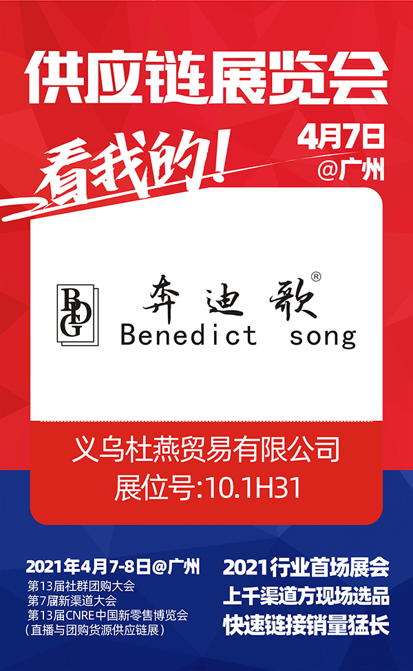 2021社群团购供应链开年展定于2021年4月7日-8日在广交会展馆召开,目前正在进行展位招募。本次展会由沸点天下、沸点会展、4458货源网联合举办,以“新渠道加速新增长”为主题,旨在让更供货商快速对接新渠道,获得更增长,奔迪歌服饰有限公司强势加入2021社群团购供应链开年展!