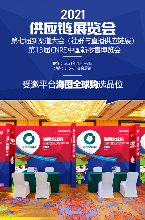 2021供应链展览会,现场采购选品,嘉宾分享干货,现场对接,学习交流,都能满足您的需求,海囤全球购诚邀供货商朋友带着产品来展位洽谈合作。