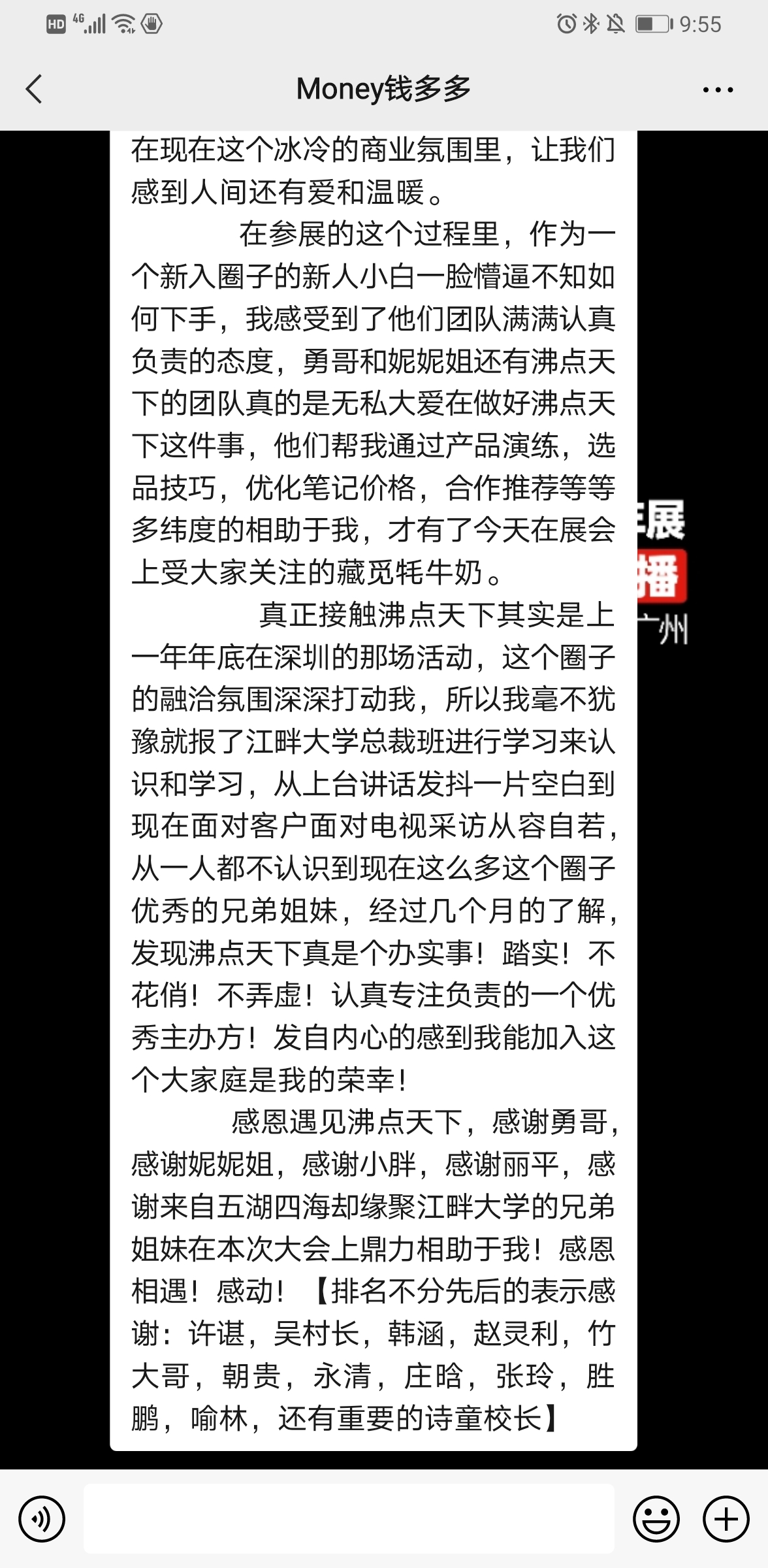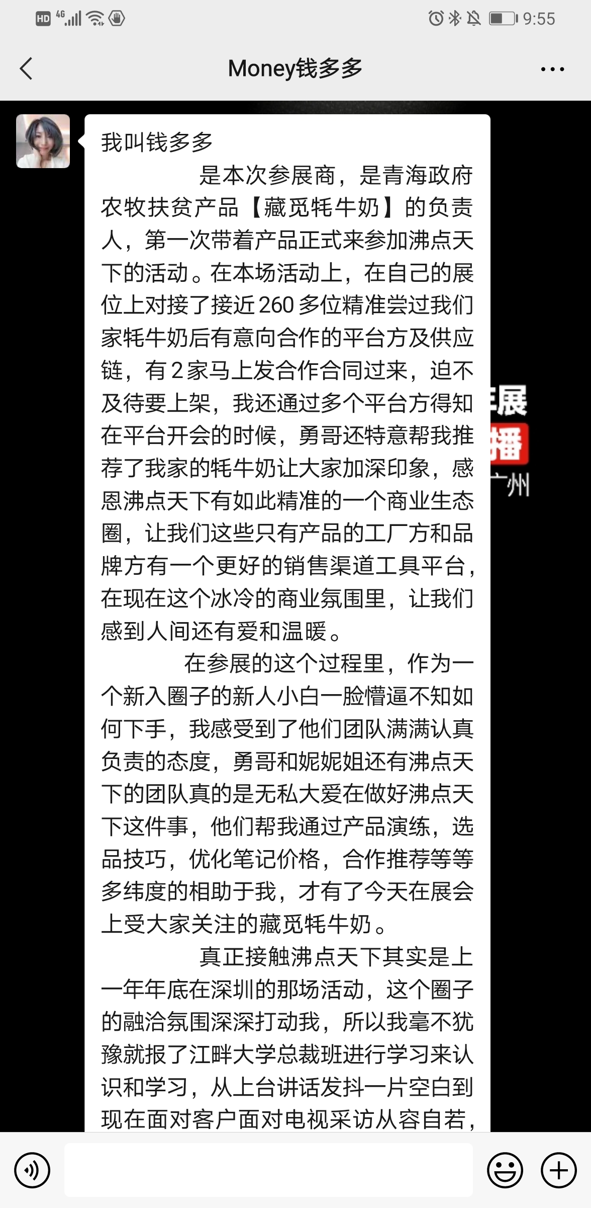 我叫钱多多,是本次参展商,是青海政府农牧扶贫产品【藏觅牦牛奶】的负责人,第一次带着产品正式来参加沸点天下的活动。在本场活动上,在自己的展位上对接了接近260多位精准尝过我们家牦牛奶后有意向合作的平台方及供应链,有2家马上发合作合同过来,迫不及待要上架,我还通过多个平台方得知在平台开会的时候,勇哥还特意帮我推荐了我家的牦牛奶让大家加深印象,感恩沸点天下有如此精准的一个商业生态圈,让我们这些只有产品的工厂方和品牌方有一个更好的销售渠道工具平台,在现在这个冰冷的商业氛围里,让我们感到人间还有爱和温暖。