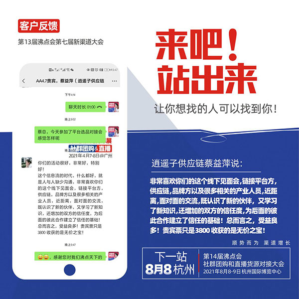 刚刚结束的第13届沸点会暨平台选品对接会,好评如潮,本次大会由沸点天下举办,吸引了来自全国的600多家供应链,和来自社群团购,社区团购,直播个人,直播机构,微信群,自媒体,平台等多个渠道的众多采购方前来找品合作,会后获得参会者一致好评,逍遥子供应链受邀参加活动。