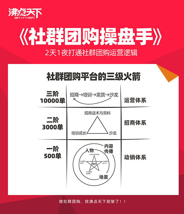 为顺应大家的要求,沸点天下推出了社群团购平台操盘手课程,与创始人一起探讨当下的市场,重新定义社群团购,重新定义人货场,也与大家一起梳理动销系统,招商系统与运营系统。